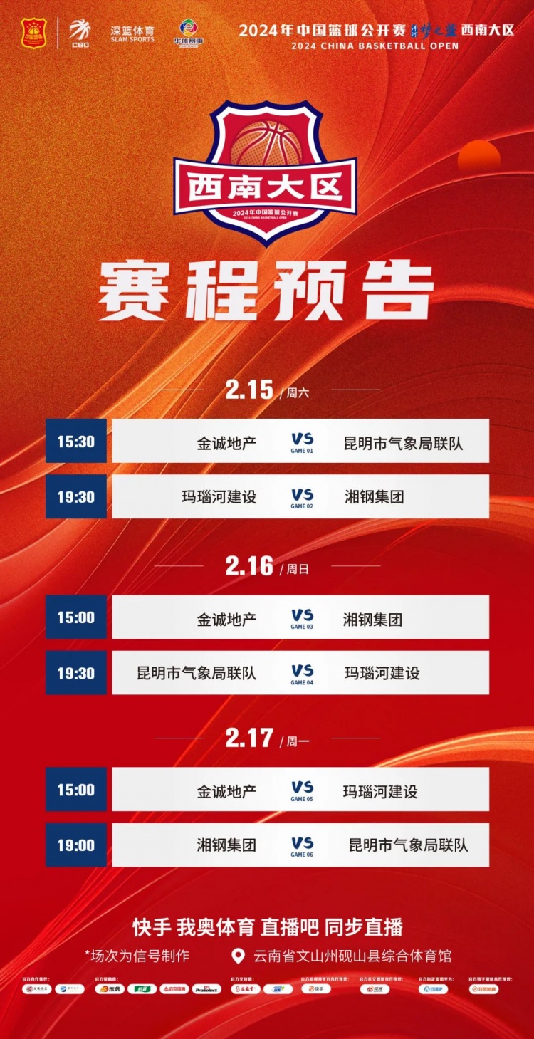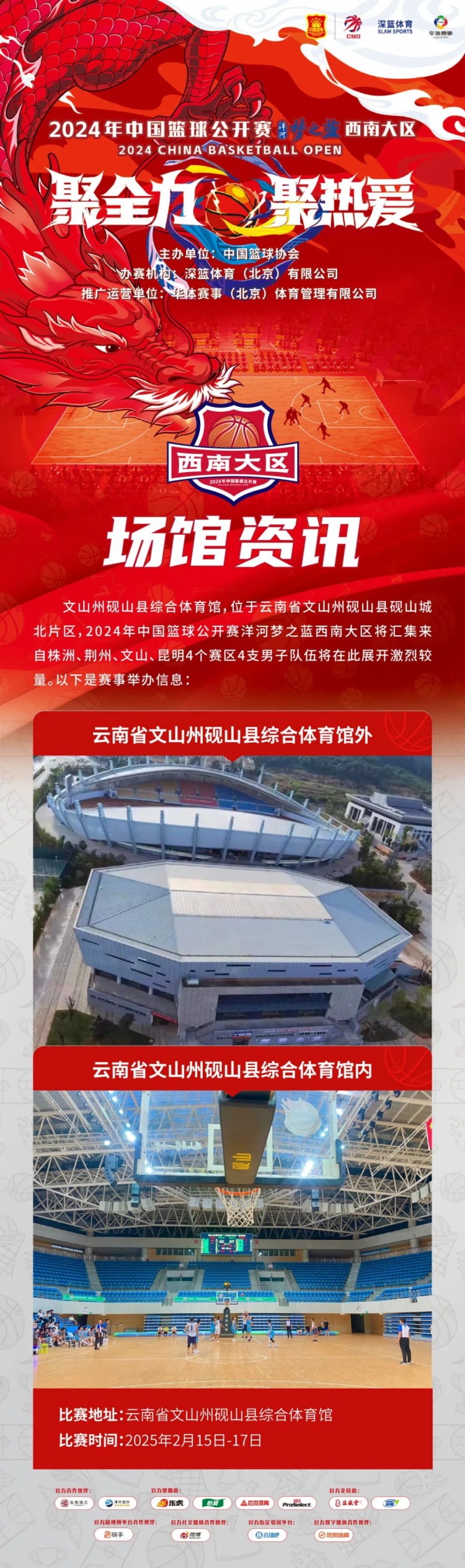 2月15日-17日,2024年中国篮球公开赛洋河梦之蓝西南大区赛将在云南省文山州砚山县综合体育馆举办,来自西南赛区各省市的4支男篮队伍将在文山砚山激烈争夺通往全国总决赛的入场劵。新年伊始,齐聚文山,谁能在这场激烈竞争中突出重围,捧起通过全国总决赛的希望之钥,让我们拭目以待! 赛事具体举办信息如下: