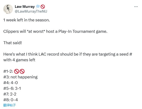 球迷直播4月7日讯 今日比赛过后,快船排名西部第五。 球队记者Law Murray发文分析了快船的排名前景: 1-3:不可能 4:4胜0负 5-6:3胜1负 7:2胜2负 8:0胜4负 快船还剩下4场常规赛,对手分别是马刺、火箭、国王、勇士。