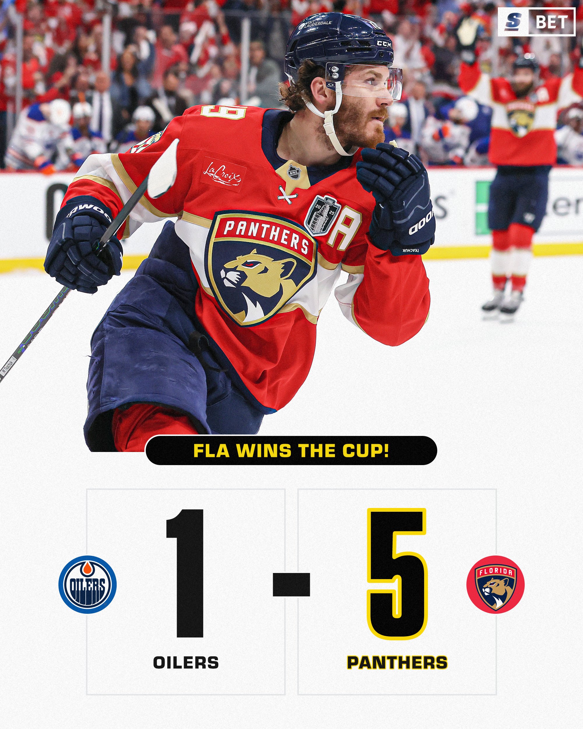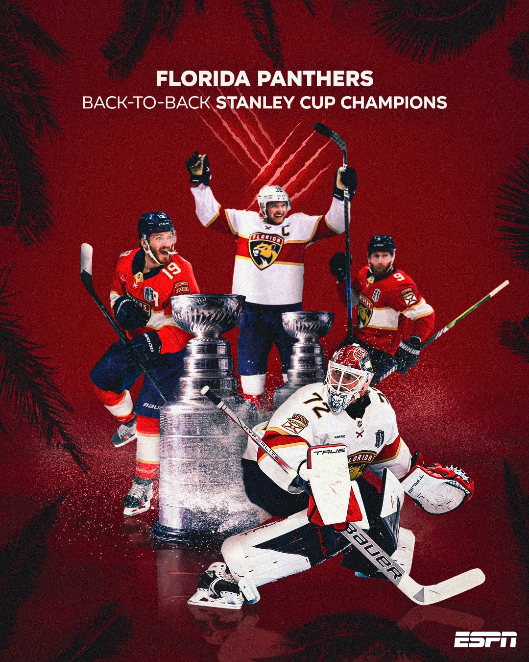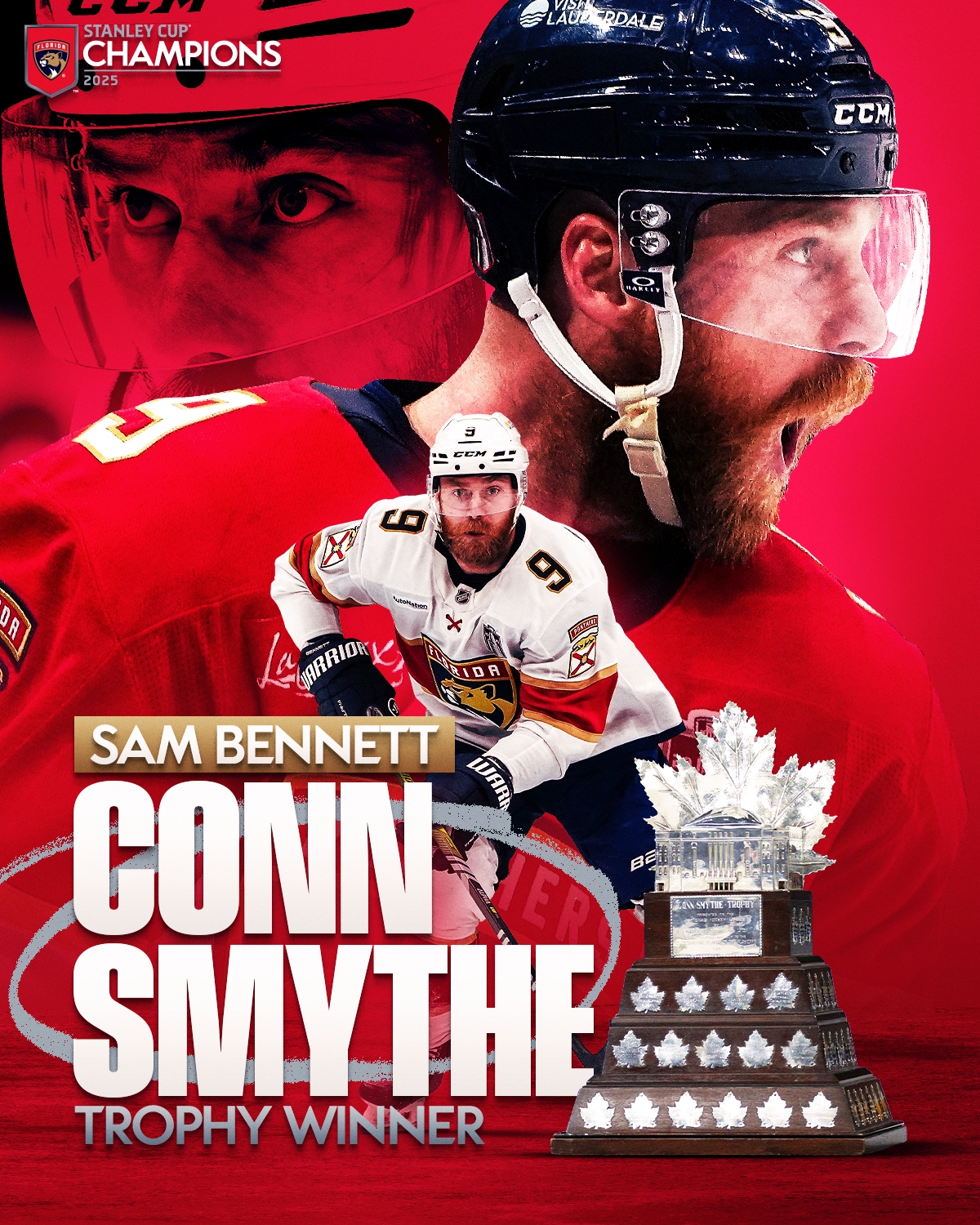 球迷直播06月18日讯 NHL总决赛G6,佛罗里达美洲豹5-1击败埃德蒙顿油人,大比分4-2实现卫冕夺得队史第二冠。 这是两队连续第二年在总决赛相遇,去年油人在0-3落后的情况下,连追三局拖入抢七。但抢七美洲豹顶住压力,2-1击败油人拒绝逆转,夺得队史首冠。美洲豹今年没有给油人太多机会,萨姆-莱因哈特在G6连进四球帮助球队捧杯。美洲豹球员萨姆-本内特获得FMVP(康恩-思迈斯奖,Conn Smythe Trophy),他在季后赛中共进球15个排在第一位。 萨姆-本内特 萨姆-莱因哈特 美洲豹连续三年打进总决赛,2023年憾负维加斯金骑士后,连续两年夺冠。油人再次无缘冠军意味着加拿大球队已32年没能捧起斯坦利杯(1993年蒙特利尔加拿大人)。