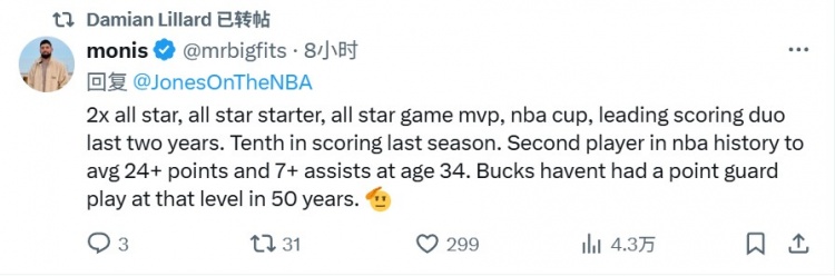 球迷直播7月4日讯 今天,雄鹿记者@Monis发推,谈到了利拉德。 他写道:“2届全明星、全明星首发、全明星赛最有价值球员、NBA杯冠军、过去两个赛季联盟得分最高的组合成员。上赛季得分排名联盟第十。NBA历史上第二位在34岁时场均能贡献24+分、7+助攻的球员。雄鹿队过去50年里从未有过达到如此水准的控球后卫。” 利拉德转发了这条内容。此前,他被雄鹿买断,将成为自由球员。