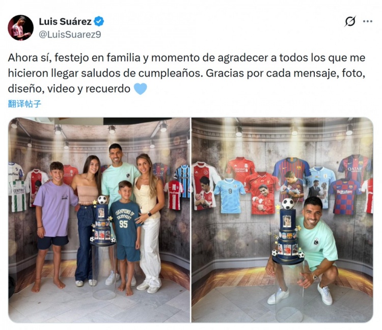 球迷直播1月26日讯 苏亚雷斯更新社媒动态,晒出庆祝39岁生日的照片。 苏亚雷斯迎来39岁生日,他在社交媒体上晒出与家人一起庆祝生日的照片,并写道:“现在终于可以和家人一起庆祝生日了,也借此机会感谢所有给我送上生日祝福的人!感谢你们的每一条信息、每一张照片、每一个设计、每一段视频和每一份美好回忆!”